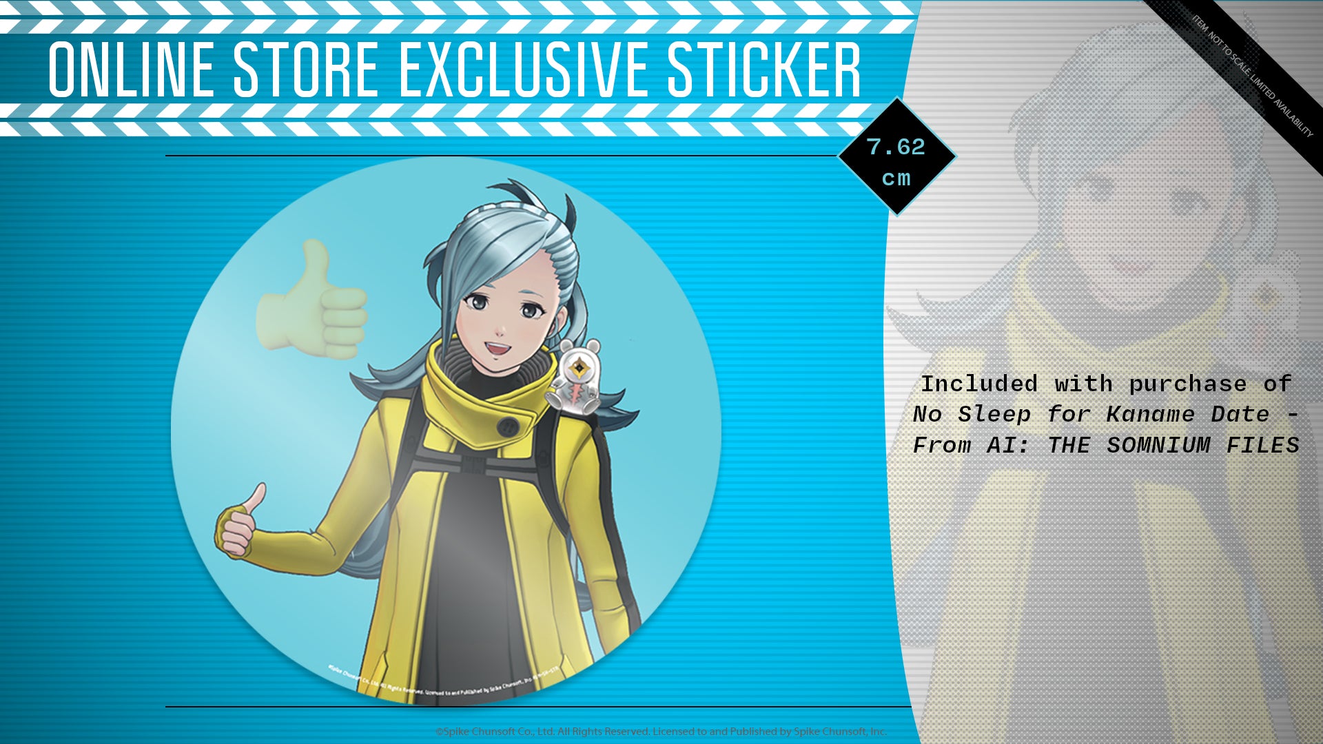 A 7.62 cm bonus Mizuki sticker is included with the purchase of No Sleep For Kaname Date - From AI: THE SOMNIUM FILES!